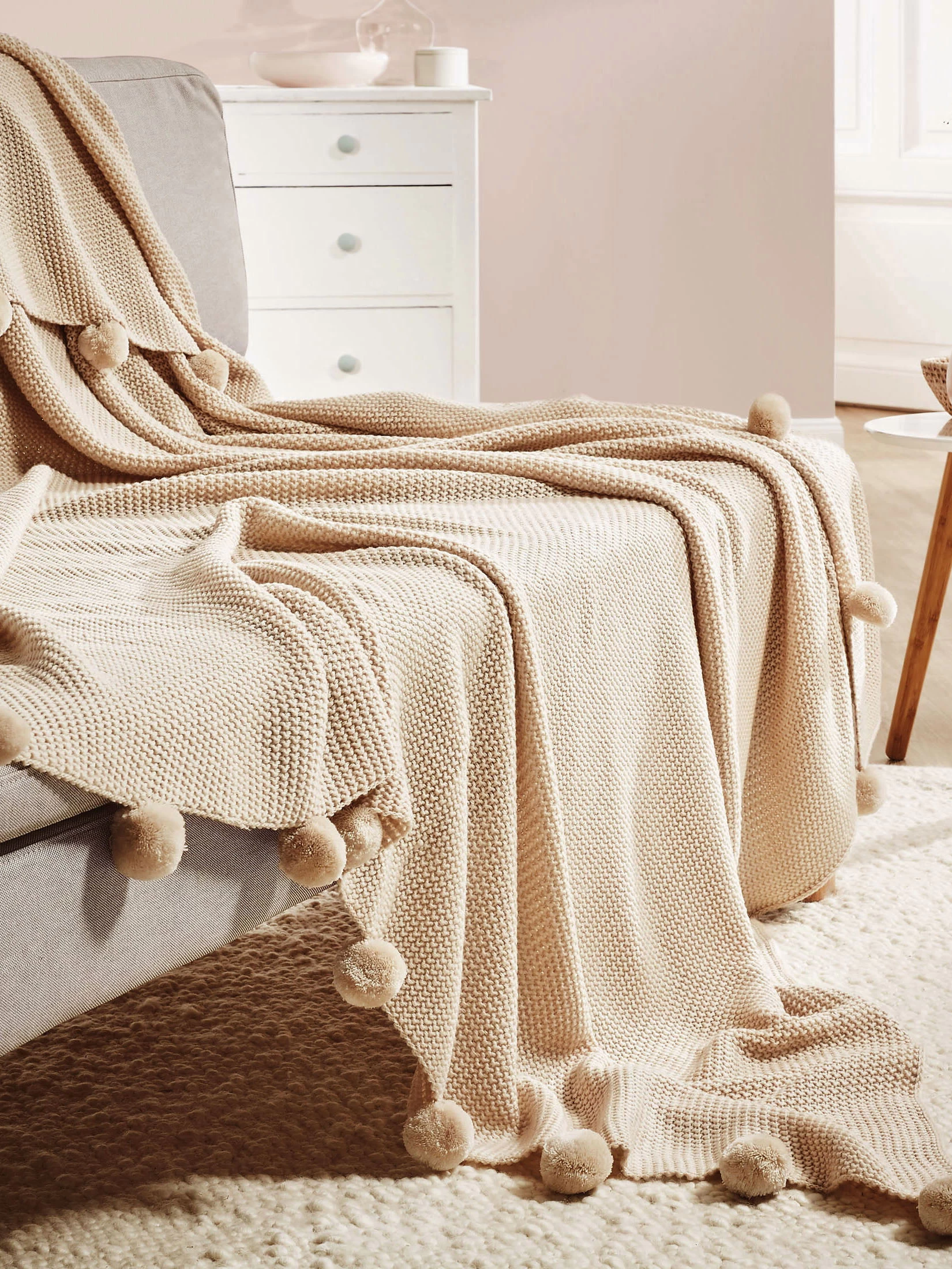 Einfach hyggelig. Verführerisch weiche Strickdecke. Material: 100 % Polyacryl. Oeko-Tex Standard 100.