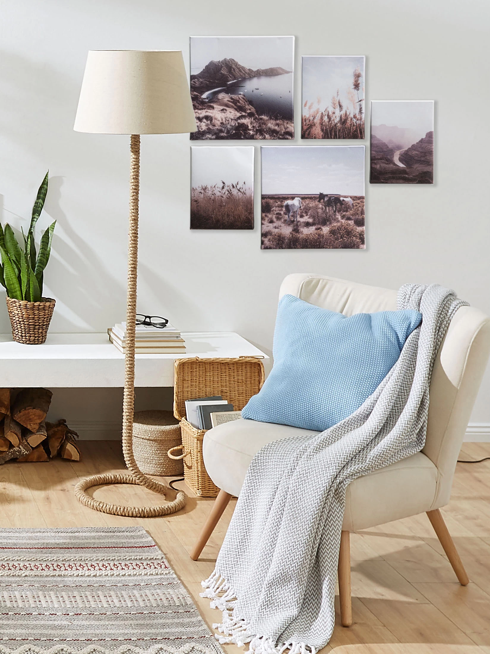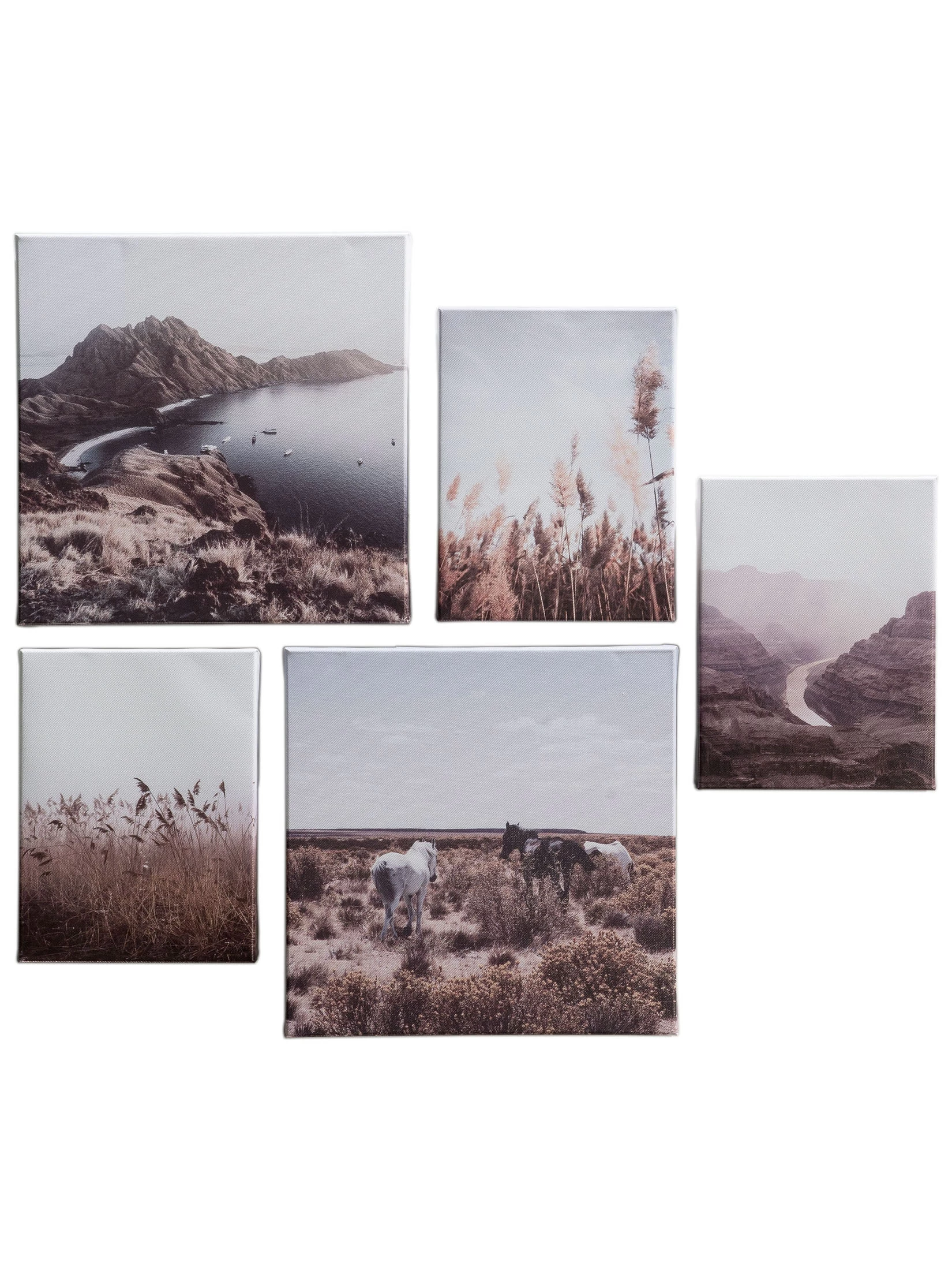Landschaftsmotive auf Leinwand gedruckt. Stabiler Echtholzrahmen. Inkl. Befestigungsmaterial. Das Set besteht aus fünf Bildern. Größen: 2 x ca. 25 x 25 cm, 3 x ca. 15 x 20 cm.
