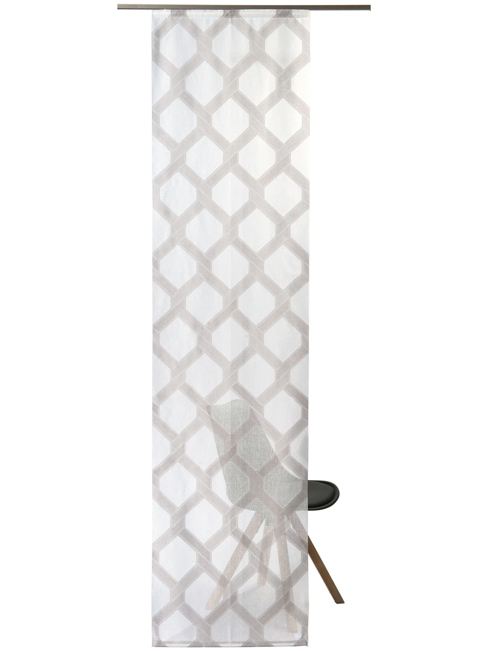 YLVA ist ein Flächenvorhang mit grafischem Wabenmuster. Der Schiebevorhang ist aus 100 % Polyester gefertigt. Öko-Tex Standard 100.