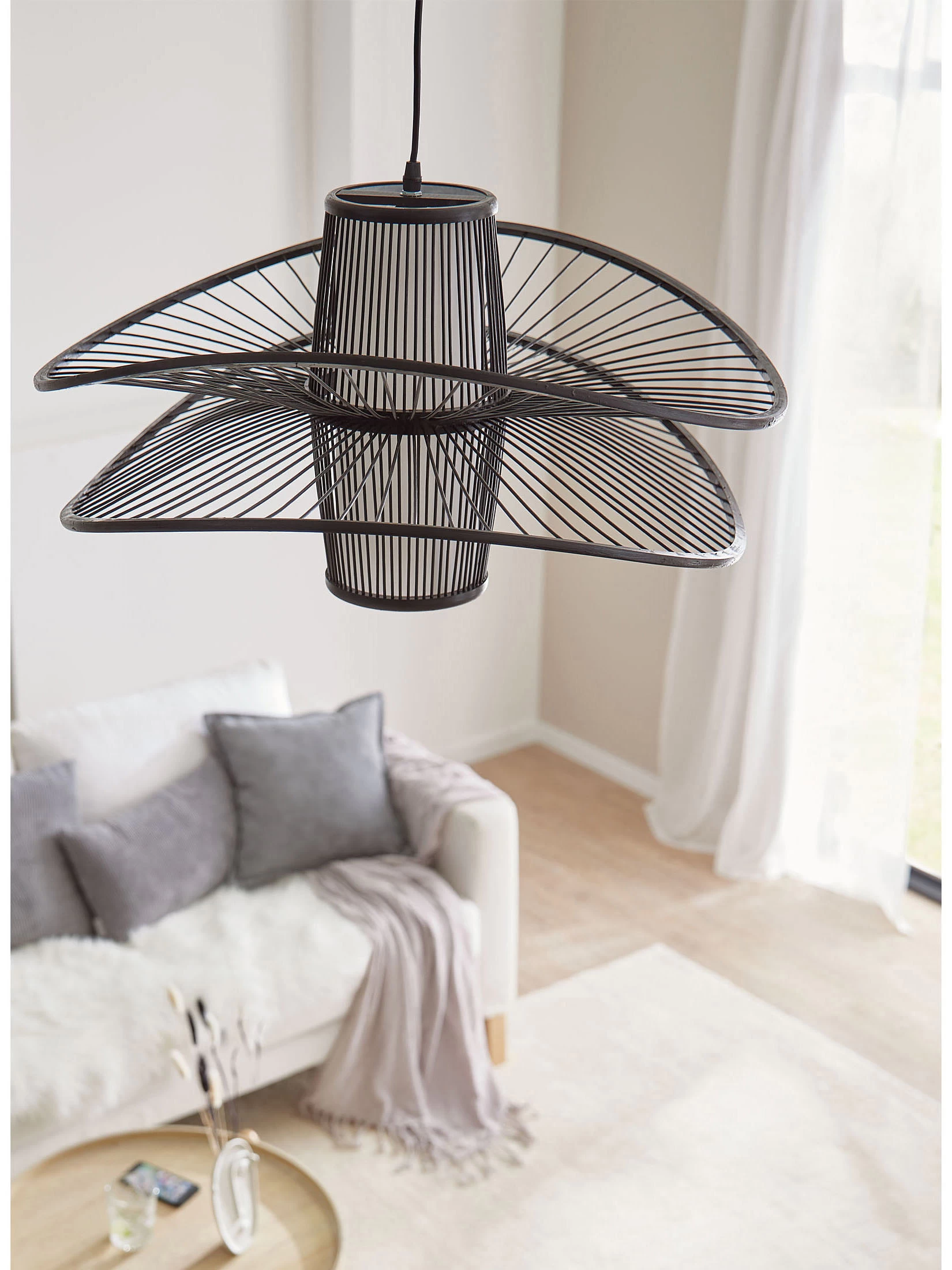 Der doppelte Lampenschirm dieser filigranen Hängeleuchte ist handgefertigt. Aus Natur-Bambus. Exkl. Leuchtmittel E27, 40W. Passend zum Japandi Stil oder zu Modern Living.