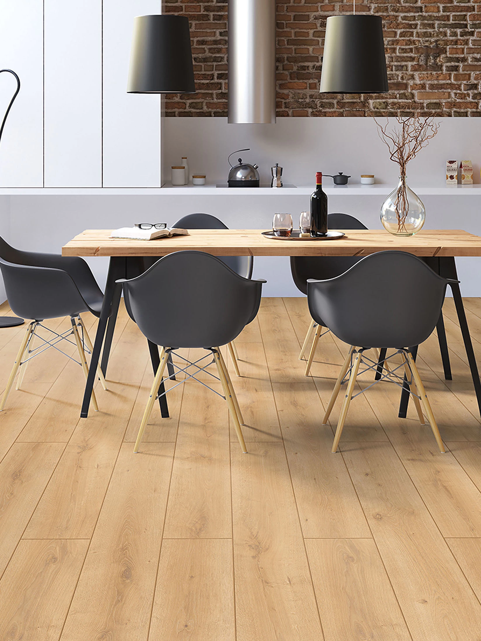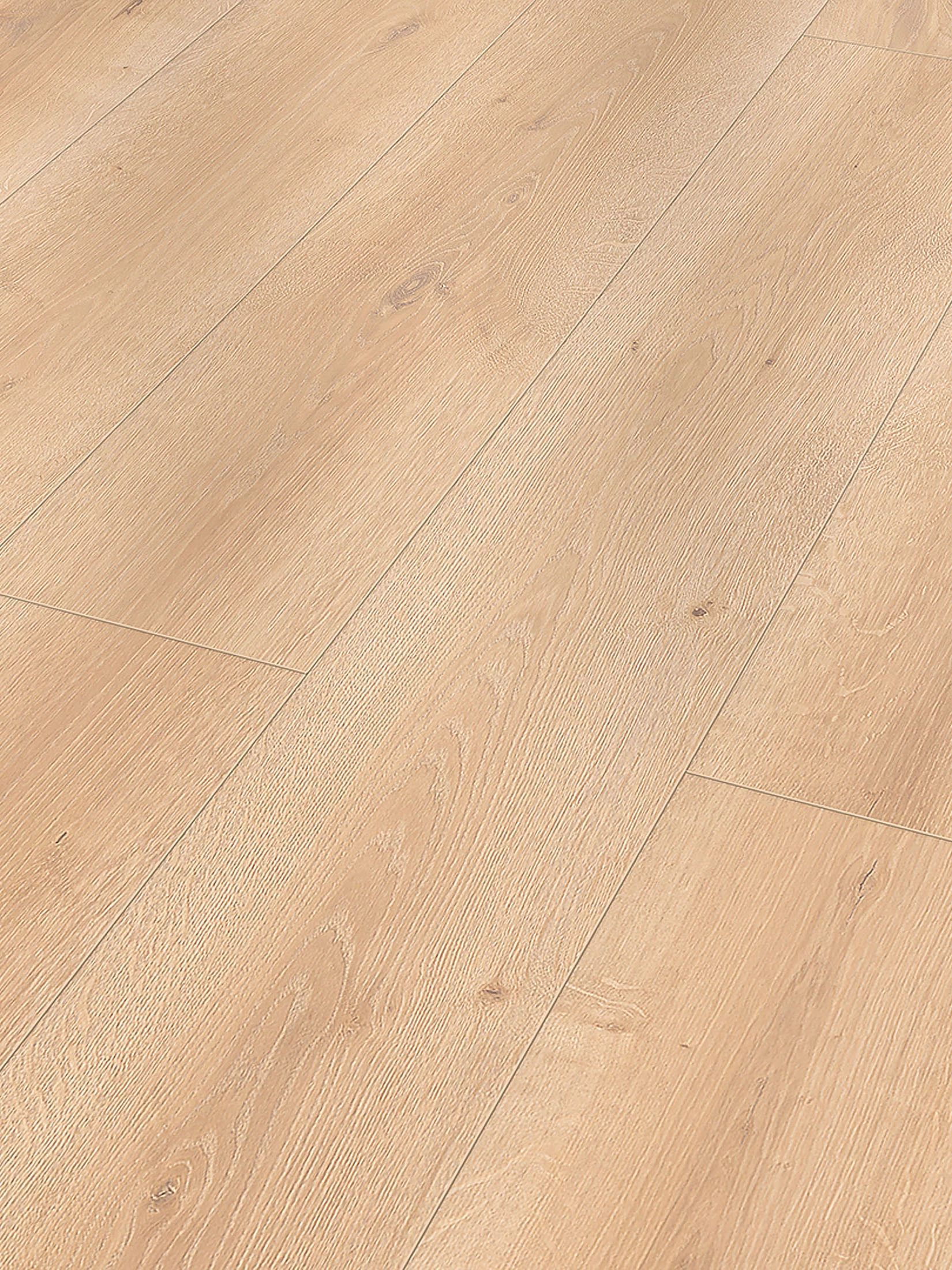Dieser Laminat-Fußboden strahlt den authentischen Charme eines handwerklichen Holzbodens aus, denn seine Pluspunkte sind nicht nur die Wertigkeit der verwendeten Materialien, sondern auch die perfekte Verarbeitung. So sorgt seine feine V-Fuge an allen vier Seiten für ein detailgetreues Fugenbild und die fühlbare Oberflächenprägung entspricht der von echtem Holz.
