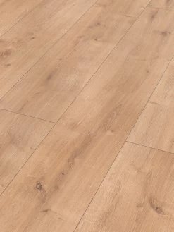 Dieser Laminat-Fußboden strahlt den authentischen Charme eines handwerklichen Holzbodens aus, denn seine Pluspunkte sind nicht nur die Wertigkeit der verwendeten Materialien, sondern auch die perfekte Verarbeitung. So sorgt seine feine V-Fuge an allen vier Seiten für ein detailgetreues Fugenbild und die fühlbare Oberflächenprägung entspricht der von echtem Holz.
