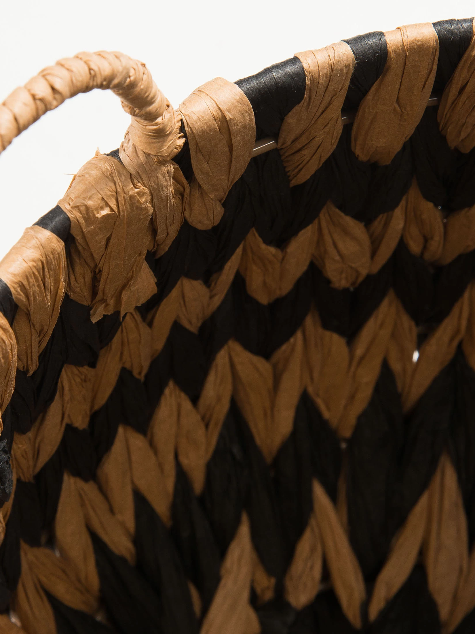 Der vielseitige Korb FLIMMER hat eine besondere Strickoptik. Gefertigt aus Papier über einem stabilen Eisengerüst. Mit Henkeln ausgestattet.