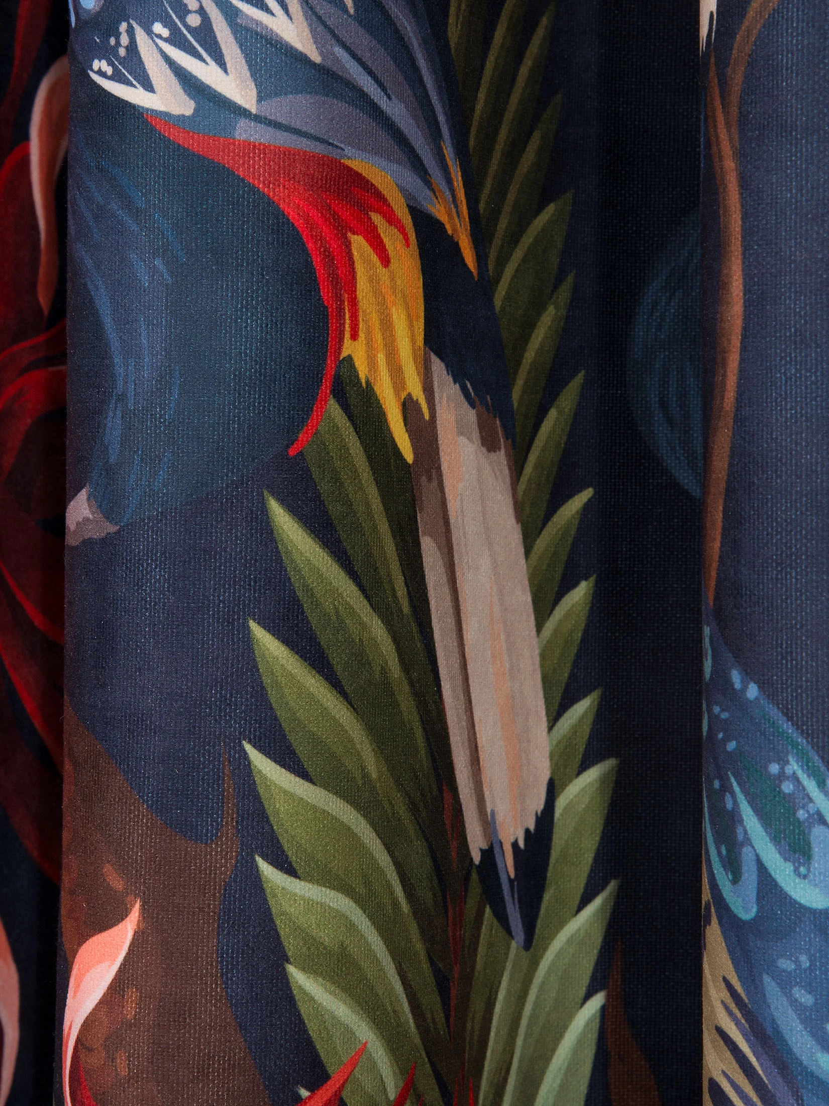 Welcome to the Jungle! Dieser Fertigschal mit silbernen Ösen ist ein absoluter Eye-Catcher. Das ausdrucksstarke Dschungel-Muster auf dunklem Hintergrund ist ein Trendprodukt für Fans der maximalistischen Einrichtung. Dieser Vorhang ist nicht transparent und kann den Wohnraum entsprechend abdunkeln. Tucani ist aus 100 % Polyester (PES) hergestellt, ist pflegeleicht und bei 30 °C waschbar.