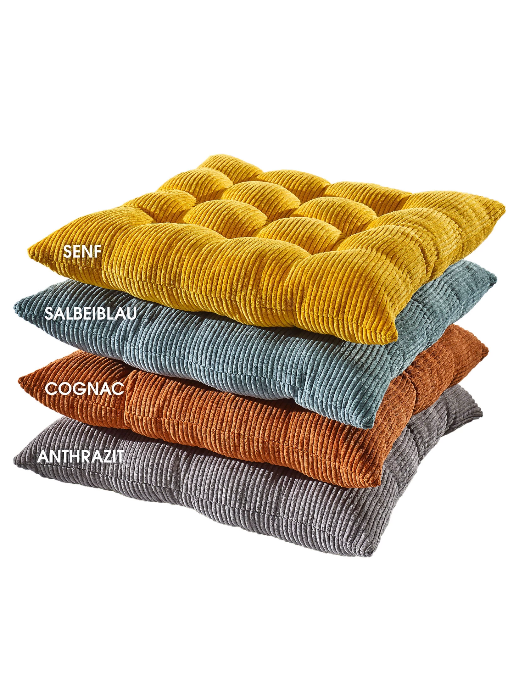Klassiker wieder entdeckt – Cord – der Trendstoff. Die Stuhlkissen sind aus samtweichen Chenillecord gefertigt. 100 % Polyester. Waschbar bis 30°C. Füllung aus 90 % Polyester und 10 % Polypropylen.