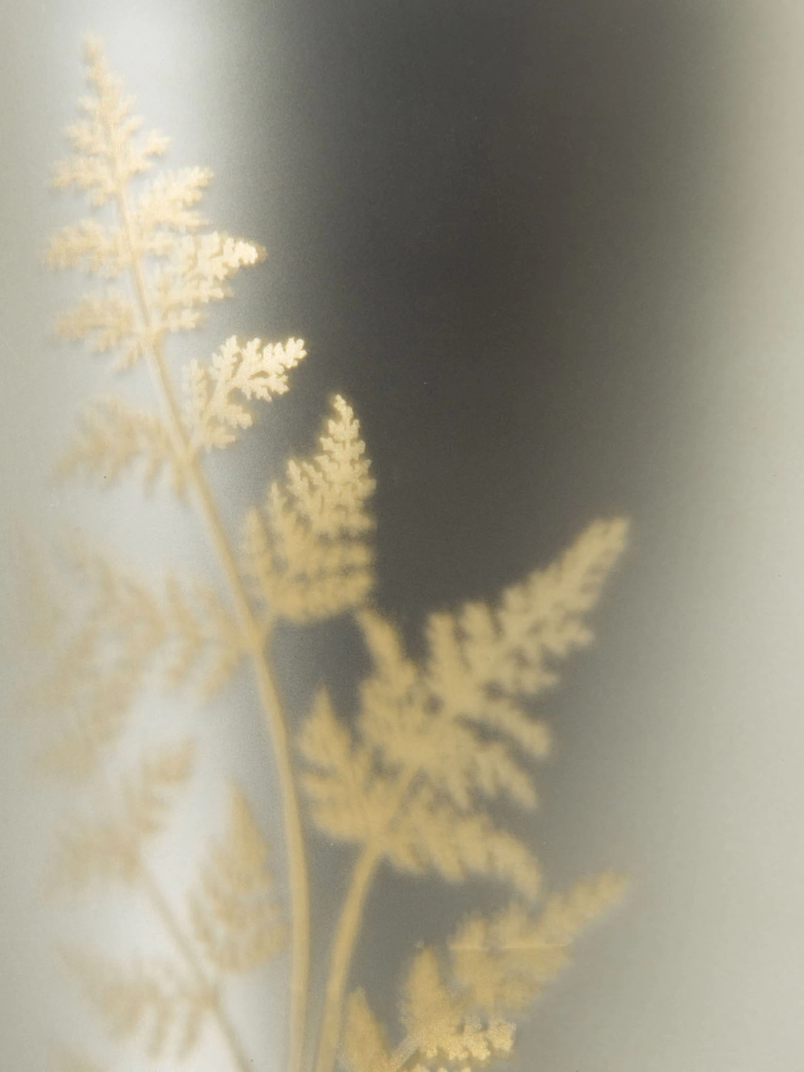 Teelichthalter aus Glas mit Laser Cut Motiv. Von innen gold verspiegelt. Mit stilvollen Farn-Motiv.