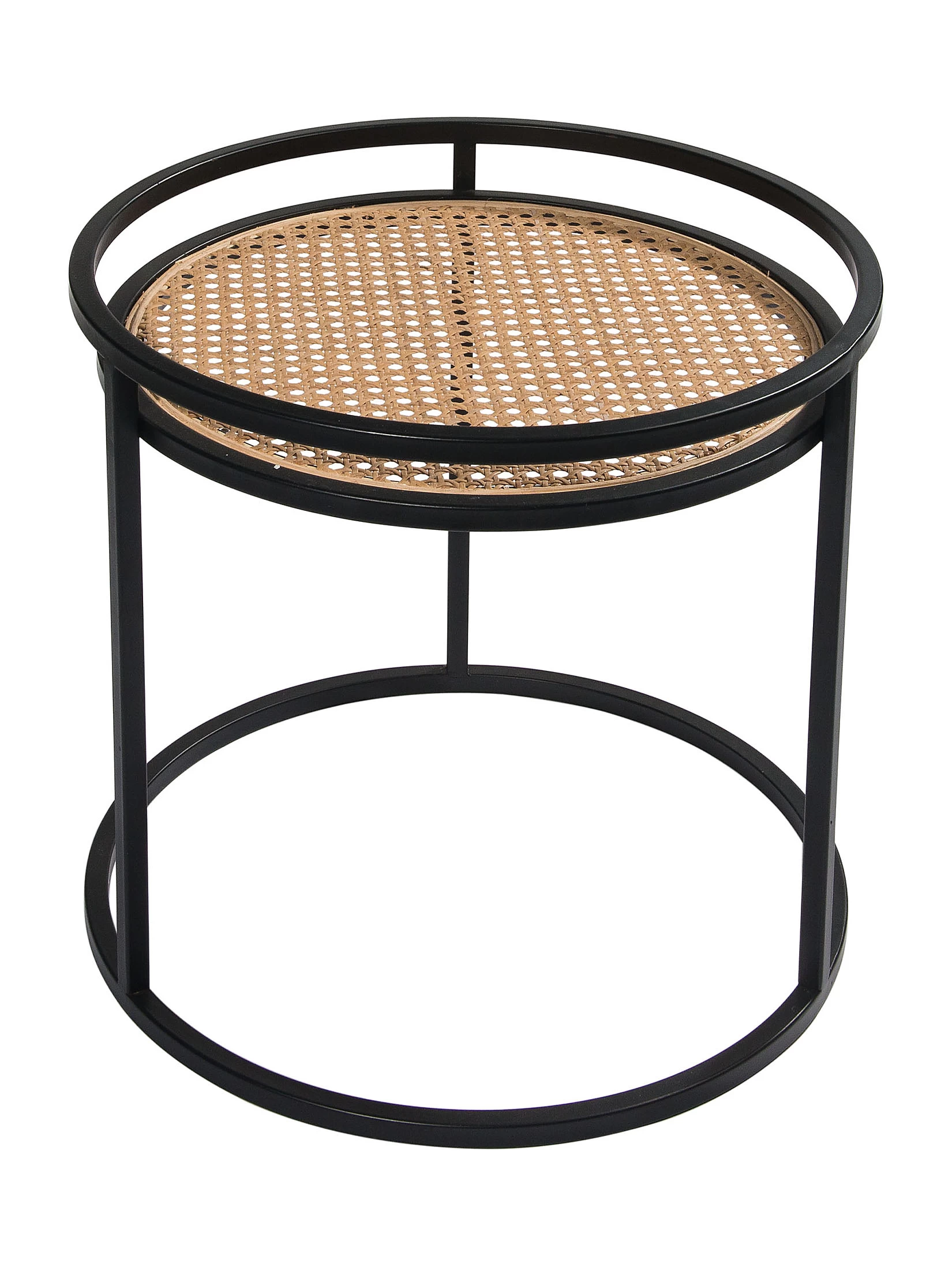 Runder Tisch mit Tischplatte aus klassischem Wiener Geflecht. Tischgestell aus schwarzem Metall.