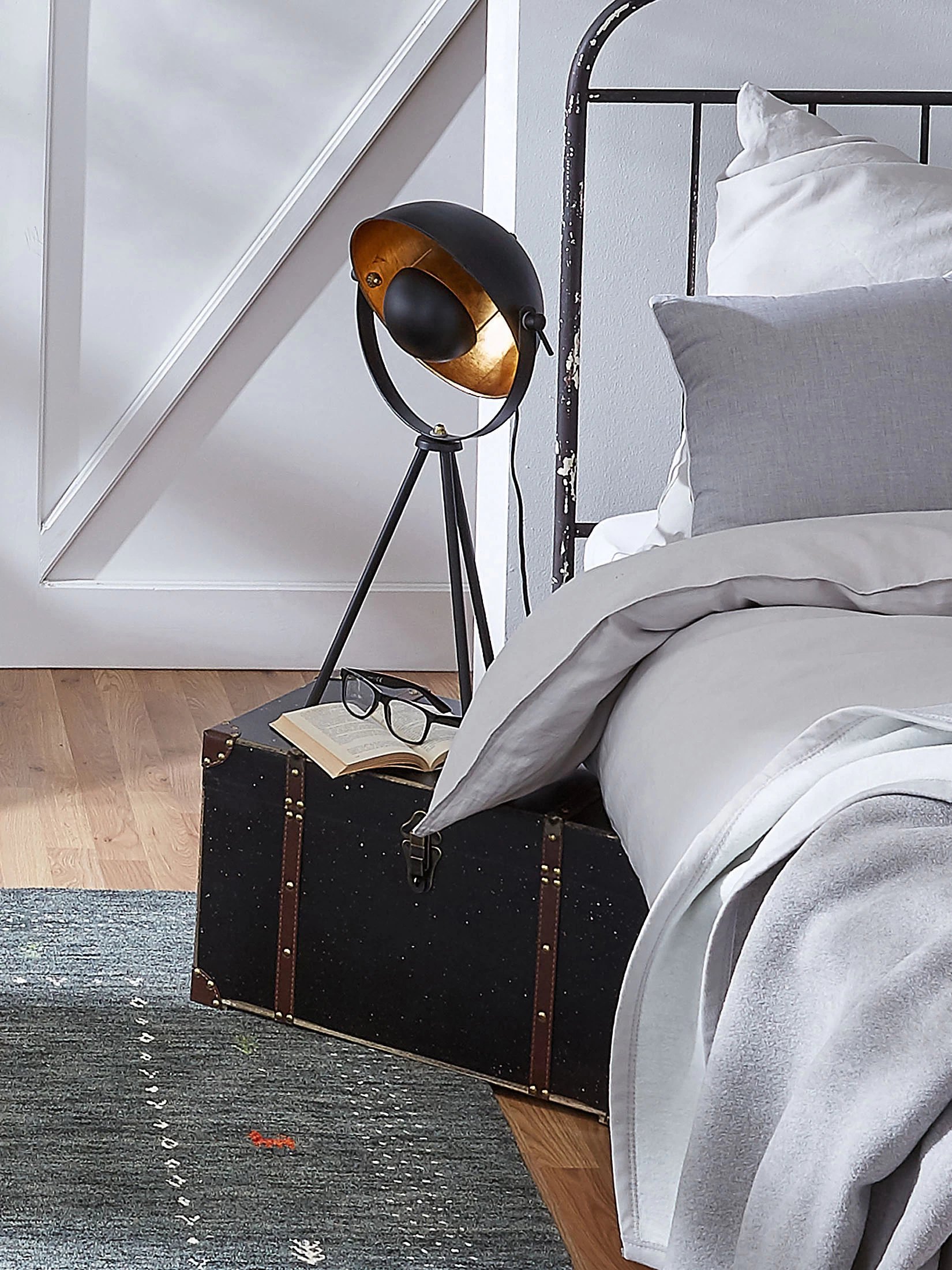 Dreibeinige Tischleuchte aus Metall. Excl. Leuchtmittel, E27 max. 40W. EEK: A++-E. In Schwarz/Gold oder Weiß/Silber. Größe ca. 28 x 63 cm.