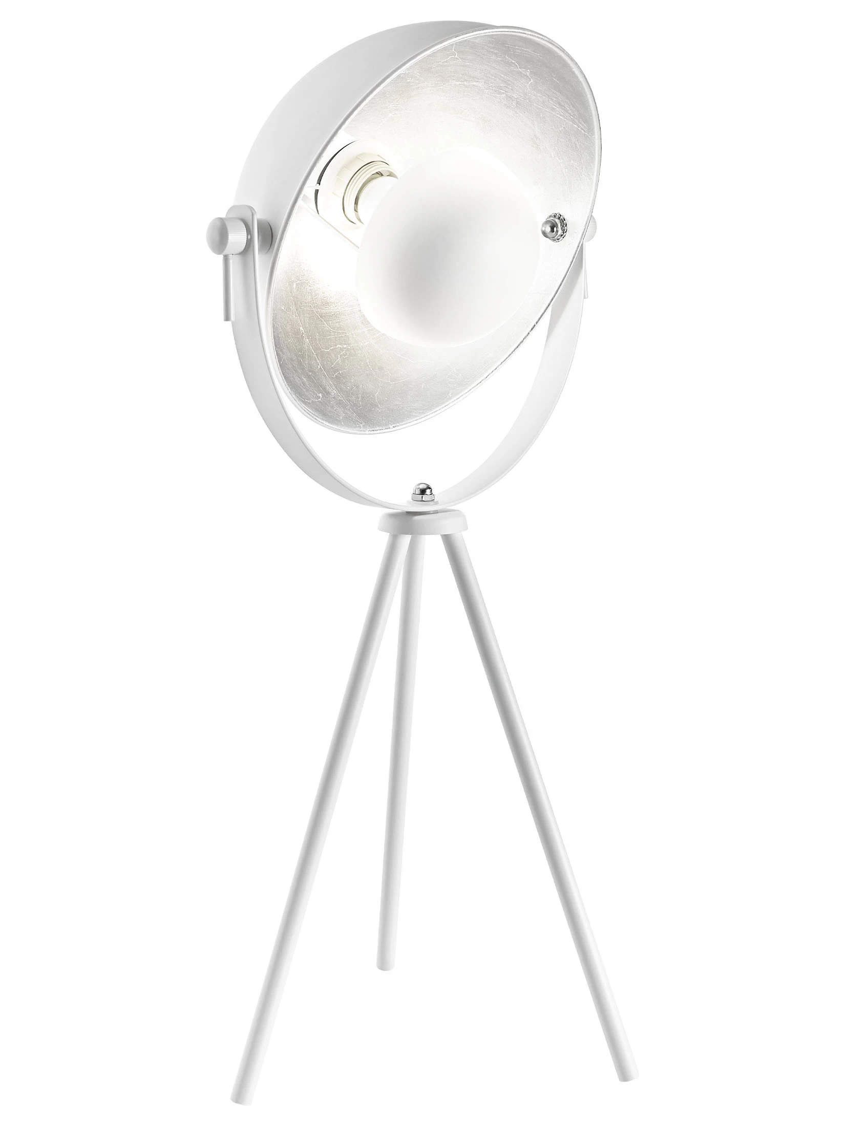 Dreibeinige Tischleuchte aus Metall. Excl. Leuchtmittel, E27 max. 40W. EEK: A++-E. In Schwarz/Gold oder Weiß/Silber. Größe ca. 28 x 63 cm.