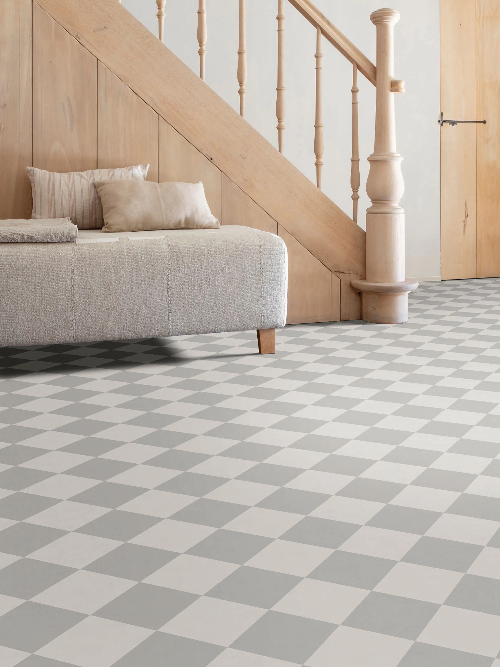 Pflegeleichter Bodenbelag in Caro-Optik. Stärke ca. 2,8 mm, Rollenbreite ca. 200 cm.