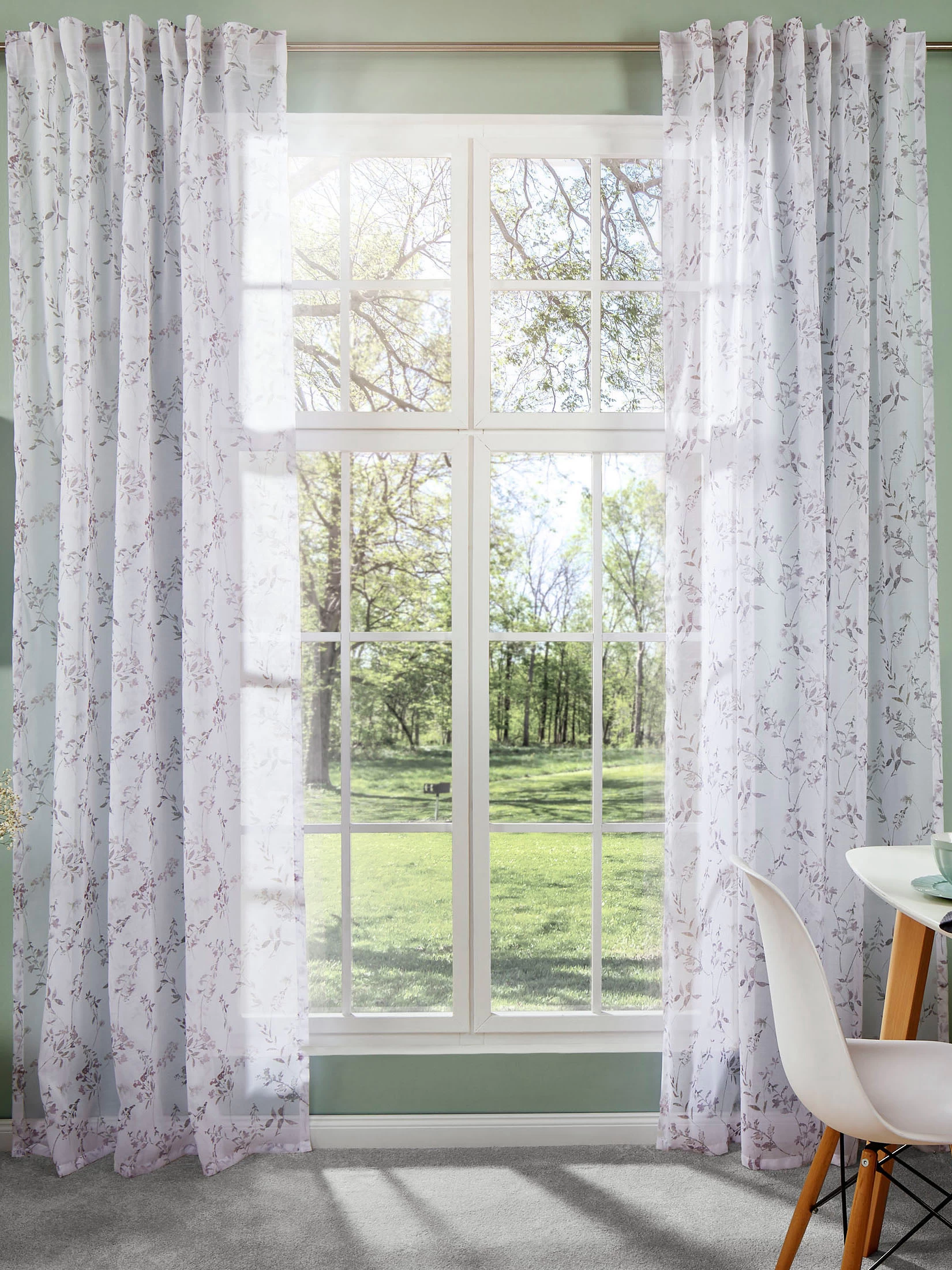 Frischer Look in angesagter Pastellcolorierung. Halbtransparenter Stoff aus 100 % Polyester. Gardinenband mit verdeckter Schlaufe. Waschbar bis 30°C. Oeko-Tex Standard 100.