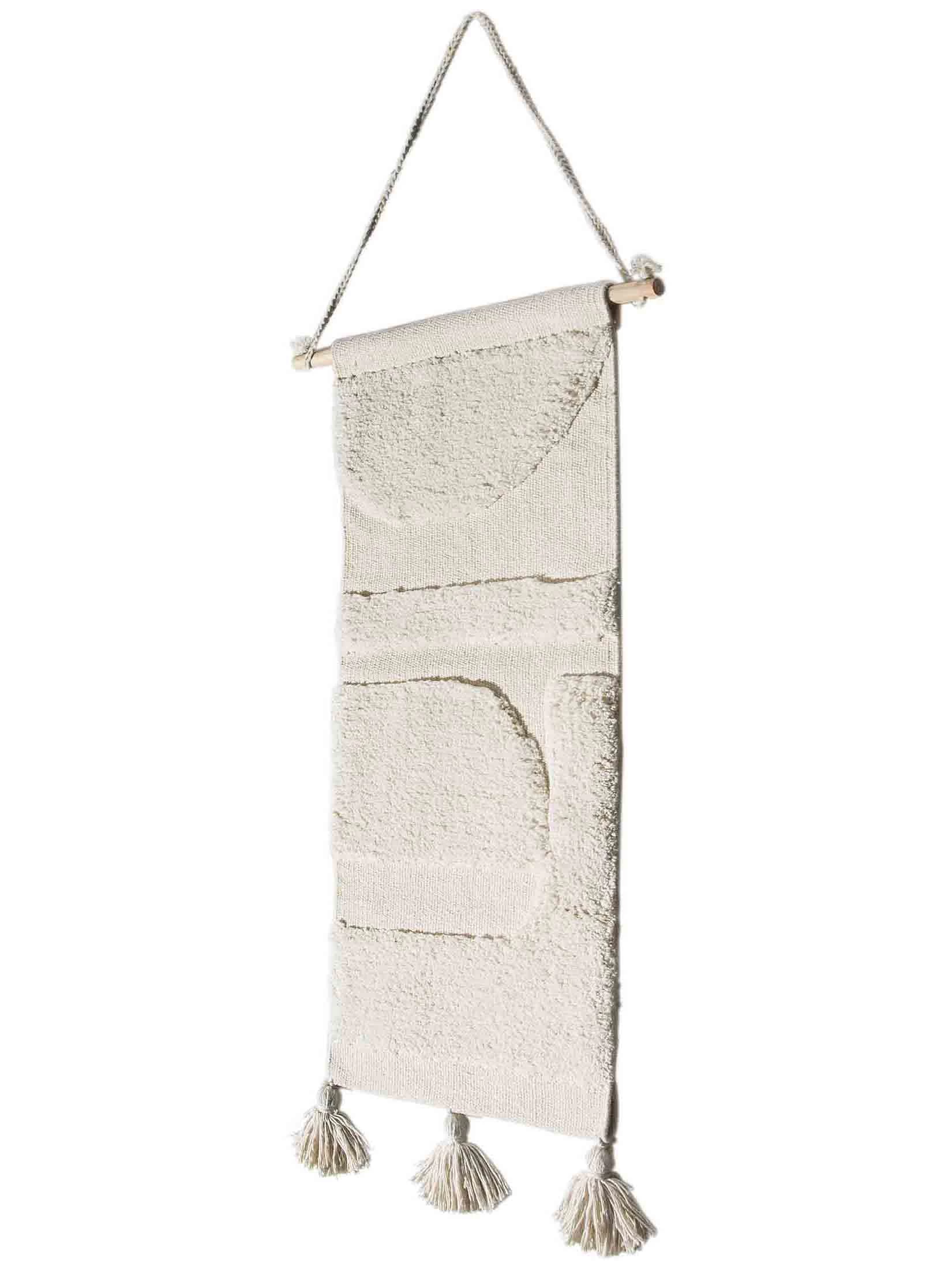 Einzigartiger, textiler Wandteppich, der Wärme in jeden Raum bringt. Er wird von Hand mit großer Sorgfalt hergestellt. Auf dem gewebten Untergrund sorgt ein dezentes, aber modernes getuftetes Muster dafür, dass sich das Modell vielseitig platzieren lässt.